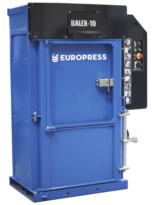 The Europress Balex-10 is a compact and versatile vertical waste baler with 10 tons of compression force producing very dense 80–110 kg bales.