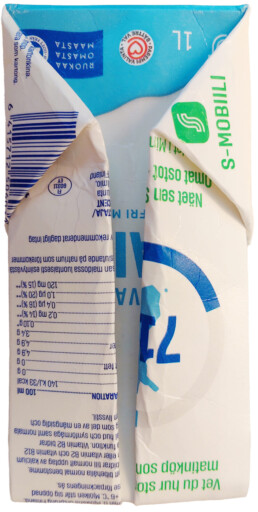 Jussin maitopurkin kierrätystekniikka säästää tilaa.