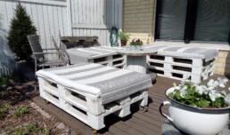 Mari on sisustanut terassin kuormalavoista tuunatuilla sohvilla ja kierrätettynä hankituilla somisteilla.