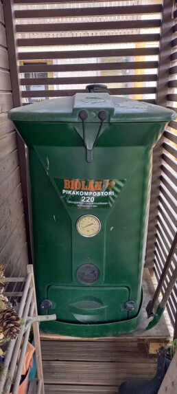 Kierrätykseen lähtevä materiaali on omissa pusseissaan ja pihaan kuuluu luonnollisesti kompostori.