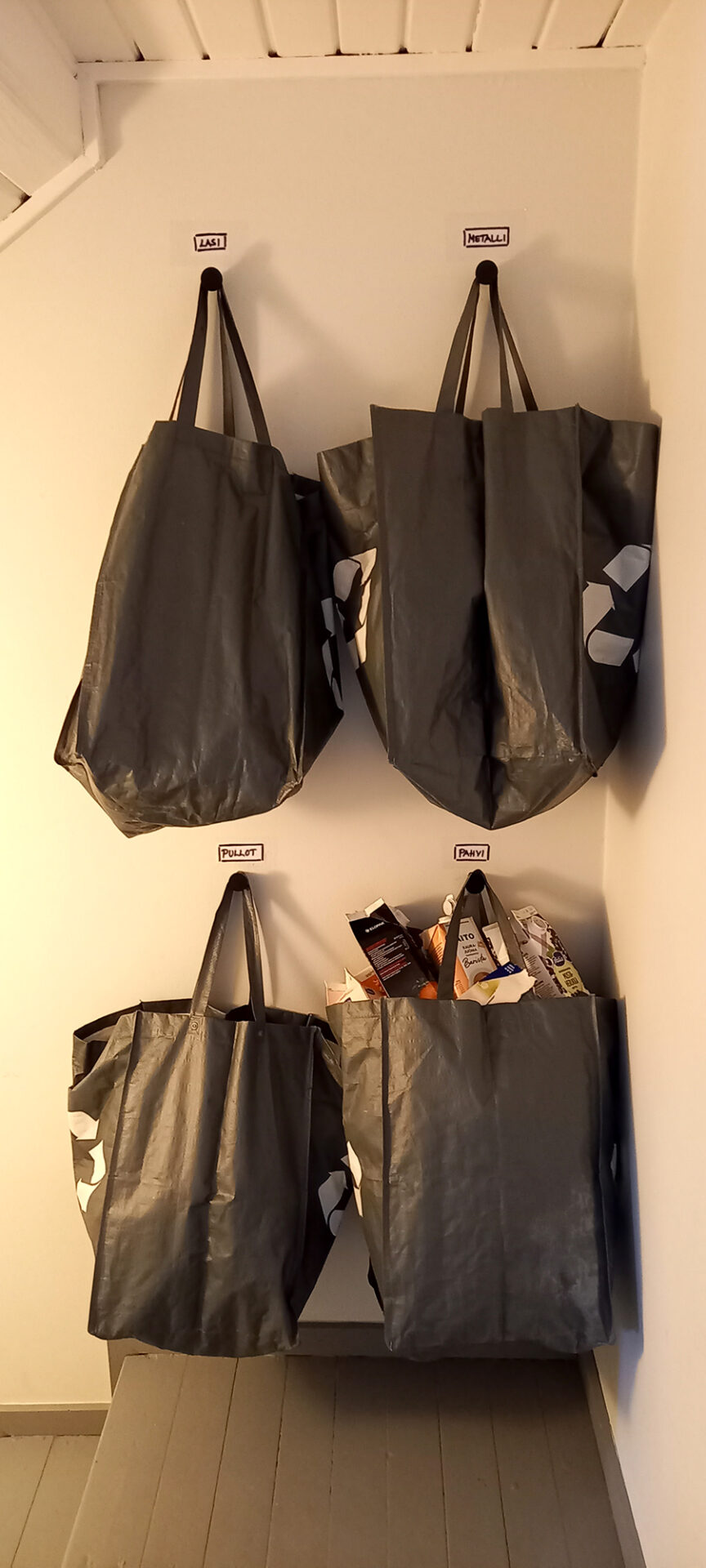 Lasi, metalli, pullot, pahvit. Kaikki kiertoon lähtevä on täsmällisesti organisoitu. Kuinkas muutenkaan, kun kyseessä on tarkka talousihminen.