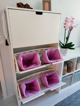 Järjestelmällisen Naanan keittiössä ei kierrätykseen jonottavat jätteet pursuile siellä ja täällä. Kenkäkaappi muuntuu nerokkaasti keittiön kierrätyspisteeksi ja visuaalinen ilme on mitä siistein.