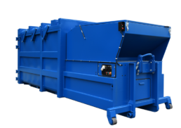 Mobil avfallskomprimator for ekstremt store laster. Takkonstruksjonen sikrer enkel tømming av det komprimerte materialet.