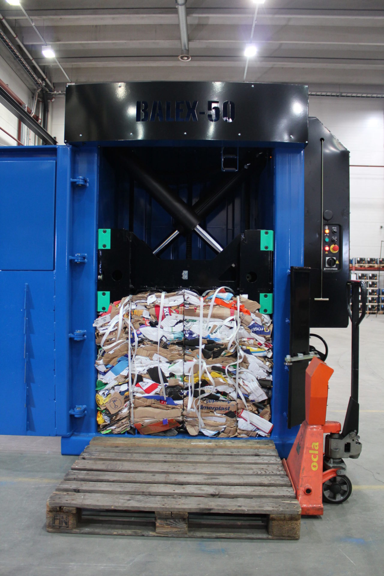 Hvis du ikke har plass til en avfallskomprimator, kan du bruke en Balex® avfallsballepresse. Den passer godt inn i avfallsrommet selv hvis plassen er trang. Balex kommer i seks forskjellige størrelser, og alle er gode til å utnytte plassen. Når ballepressen er full, kan ballen flyttes over til en pall for videre behandling. Den mest populære ballepressen, Balex-30, har 30 tonn komprimeringskraft og produserer kompakte baller på 280–320 kg. Dette gjør en enorm forskjell sammenlignet med en 770-liters avfallsdunk med hjul og en maksimal kapasitet på 360 kg, eller en 240-liters avfallsdunk med en kapasitet på 110 kg. En enkelt ball veier det samme som en 770-liters avfallsdunk full av ukomprimert papp som må tømmes på stedet. Med Balex kan du bare fjerne ballen og umiddelbart fylle på med mer materiale.